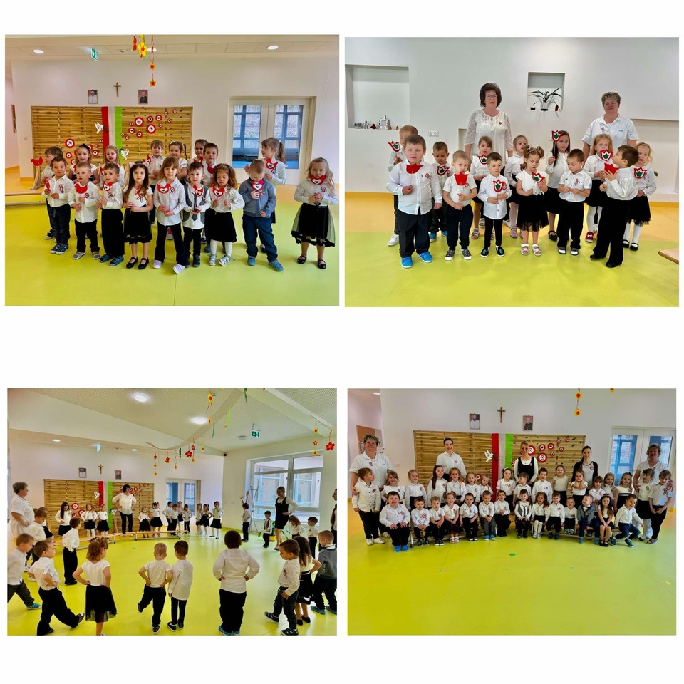 Az ünnepi műsort követően verbunkos táncházzal leptük meg a gyermekeket, majd a  héten készített nemzeti színű alkotásainkat helyeztük el az óvoda bejáratához.
